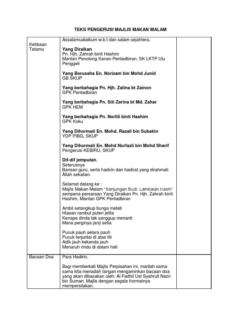 Mengumumkan ketibaan tuan pengetua smvbl tn hj. Sabtu 5 sept 2015 tempat. Skrip pengacara majlis makan malam / teks pengacara majlis formal pdf document : Teks pengacara majlis makan malam tidak formal teks pengacara majlis formal please fill this form we will try to respond as soon as possible . Contoh teks ucapan pengacara majlis sempena jamuan. Skrip pengacara majlis makan malam persaraan.